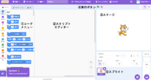 画面右上にあるのはステージ(3)です。ここではプログラムの動きが確認できます。スクリプトエディターにコードブロックをドラッグ&ドロップすることで作成したプログラムは、ステージ上の実行ボタン(4)(旗のマーク)のクリックで実行できます。ステージにはその結果が表示されます。
