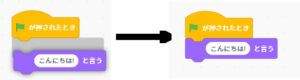 - つづいて、画面左上の[コード]タブの[見た目](紫色の丸)をクリックして見た目に関するコードブロックを表示し、上から2つめの[(こんにちは!)と言う]ブロックを、スクリプトエディターにドラッグします。このとき、マウスボタンを放さずに前の[緑旗が押されたとき]ブロックの下に近づけると、グレーの領域が現れます。これは今、吸着できるタイミングであることを示しています。グレーが表示されているときに、ドロップします。すると、下のブロックが上のブロックに吸い付きます。