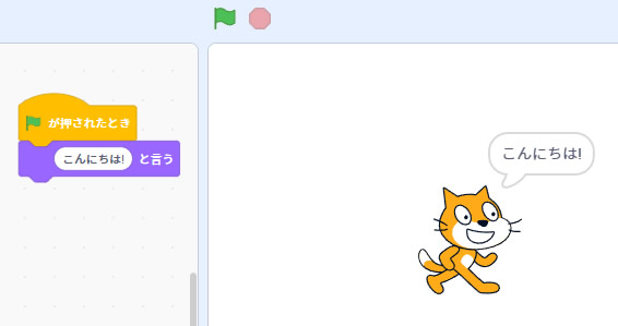 - ステージ左上にある旗のボタンをクリックします。するとプログラムが実行され、ネコが「こんにちは」と言います。このプログラムはこれで完成です。