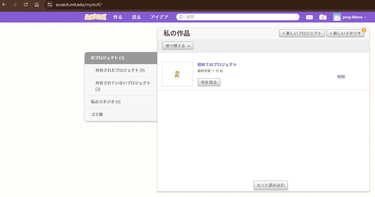 自動的に保存されたプロジェクトのファイルは、次回、スクラッチのサーバーにログインしたとき、画面右上端のユーザー名の左のフォルダアイコンのクリックで表示される[私の作品]パネルから読み込むことができます。